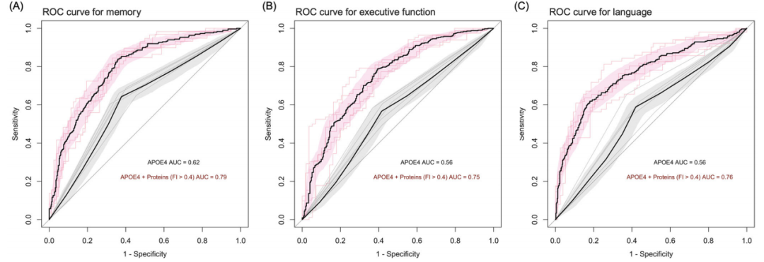训练机器学习模型以评估蛋白质特征对纵向认知轨迹的预测性能,模型 1 采用逻辑回归训练,以APOE基因型作为输入特征。模型 2 采用八种不同的机器学习算法训练,将APOE及DPA中鉴定的蛋白质整合为输入特征。对于MEM复合评分的纵向轨迹,模型 1 的曲线下面积(AUC)达到 0.63,模型 2 的曲线下面积(AUC)达到 0.76。与MEM预测模型的结果一致,与仅含APOE的模型 1 相比,纳入蛋白质特征的EF和LAN预测模型(模型 2)也表现出性能提升。随后基于弹性网络回归得出的绝对系数值评估特征重要性,以构建最终预测模型。研究者使用特征重要性(FI)评分 > 0.4 的蛋白质构建最终模型。FI分析显示,在MEM预测模型中,包括 YWHAB、YWHAG和YWHAZ在内的 9 种蛋白质的重要性值 > 0.4;在EF模型中,YWHAG、YWHAE、NPTX2和GARS1这 4 种蛋白质的重要性值 > 0.4;在LAN模型中,YWHAZ、YWHAG、NPTX2和MAPRE3这 4 种蛋白质的重要性值 > 0.4。MEM的最终预测模型曲线下面积(AUC)达到 0.79,相较于模型 1 提升了 27.4%。EF的最终预测模型曲线下面积(AUC)达到 0.75,提升了 33.9%。LAN的最终预测模型曲线下面积(AUC)达到 0.76,提升幅度为 35.7%(图 6)。