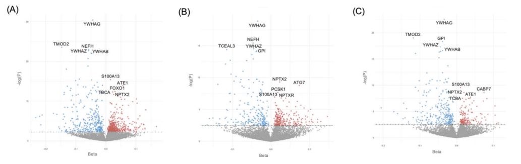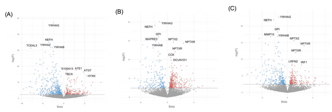 图3.基于纵向认知功能变化DPA及与记忆相关的差异丰度蛋白火山图