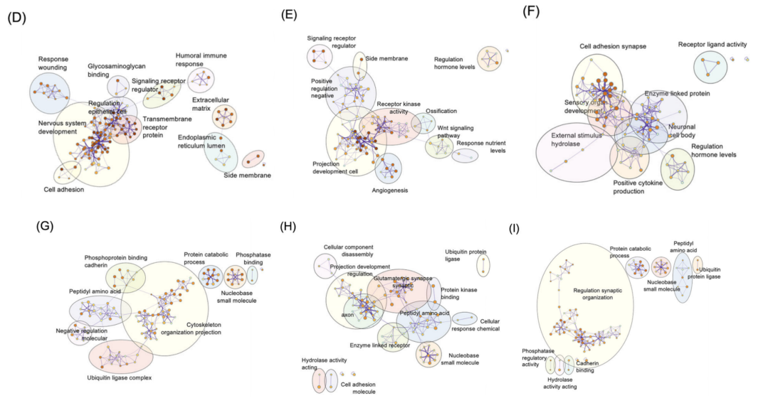 为探究差异丰度蛋白质的生物学功能,作者利用GO术语进行了通路富集分析。富集分析针对基线时各认知域的丰度升高蛋白质和丰度降低蛋白质分别进行。MEM相关的丰度升高蛋白质富集于 264 条与神经元胞体、转移酶活性调节及谷氨酸能突触轴突相关的通路(图 4D),而丰度降低蛋白质则富集于 162 条与神经元胞体、转移酶活性调节及谷氨酸能突触轴突相关的通路(图 4G)。EF相关的丰度升高蛋白质富集于 244 条与神经系统发育、神经元分化调控及细胞黏附识别相关的通路(图 4E),而丰度降低蛋白质则富集于 127 条与囊泡介导的转运调控、泛素蛋白连接酶活性及蛋白质分解代谢过程相关的通路(图 4H)。LAN相关的丰度升高蛋白质富集于 122 条与突触和轴突调控、受体调节信号传导及细胞活化调控相关的通路(图 4F),而丰度降低蛋白质则富集于 133 条与氨基酸修饰、细胞骨架组织调控及细胞外基质相关的通路(图 4I)。针对认知域的纵向变化,MEM相关的丰度升高蛋白质富集于 270 条与神经系统发育、跨膜受体蛋白及上皮细胞调控相关的通路(图 5D),而丰度降低蛋白质则富集于 163 条与细胞骨架组织和突起、蛋白质分解代谢过程及肽基氨基酸相关的通路(图 5G)。EF相关的丰度升高蛋白质富集于 141 条通路,包括与投射神经元发育、受体激酶活性及信号受体功能相关的通路(图 5E)。相反,丰度降低蛋白质富集于 94 条与轴突、谷氨酸能突触及肽基氨基酸修饰相关的通路(图 5H)。LAN相关的丰度升高蛋白质富集于 100 条与细胞黏附突触、神经元胞体及感觉器官发育相关的通路(图 5F),而丰度降低蛋白质则富集于 120 条与突触组织调控、蛋白质分解代谢过程及肽基氨基酸修饰相关的通路(图 5I)。