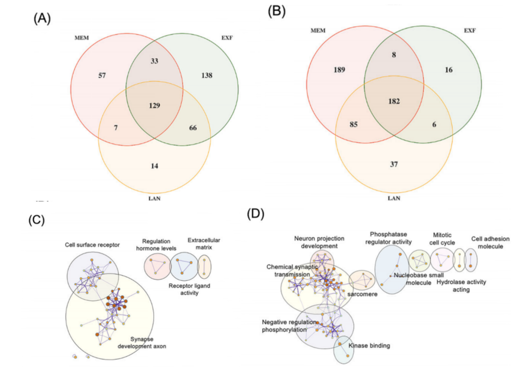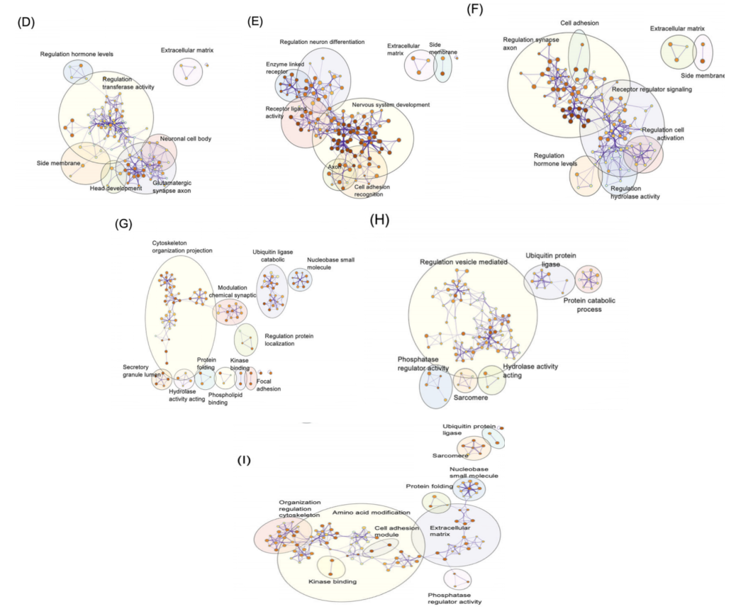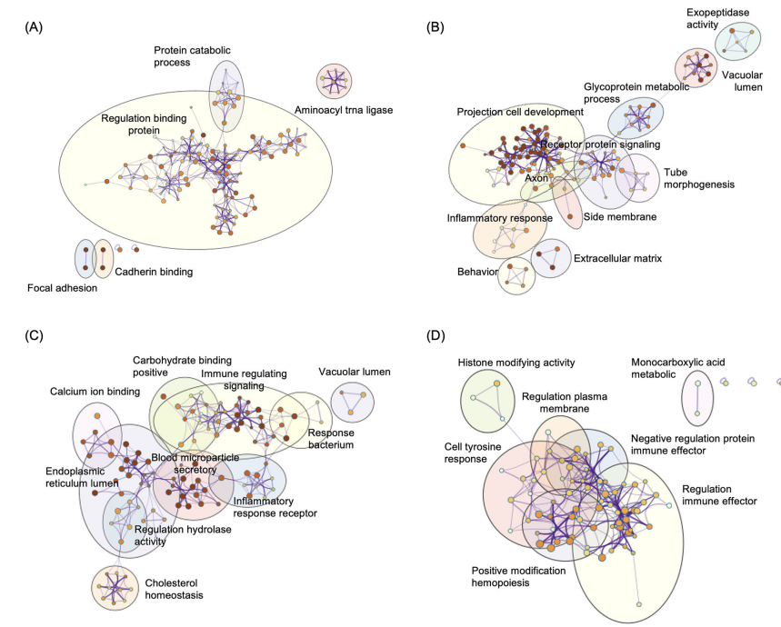为探究与特定认知域复合评分显著相关的网络模块蛋白质的生物学功能,研究者进行了GO通路分析。ME4中的274种蛋白质富集于200条与结合蛋白调控、蛋白质分解代谢过程、氨酰-tRNA连接酶活性、黏着斑及钙黏蛋白结合相关的通路(图9A)。ME5中的248种蛋白质富集于179条与投射神经元发育、炎症反应及轴突过程相关的通路(图9B)。ME6中的237种蛋白质富集于119条与胆固醇稳态、免疫调节信号及钙离子结合相关的通路(图9C)。ME7中的210种蛋白质富集于99条与免疫效应调控、组蛋白修饰活性及质膜调控相关的通路(图9D)。
