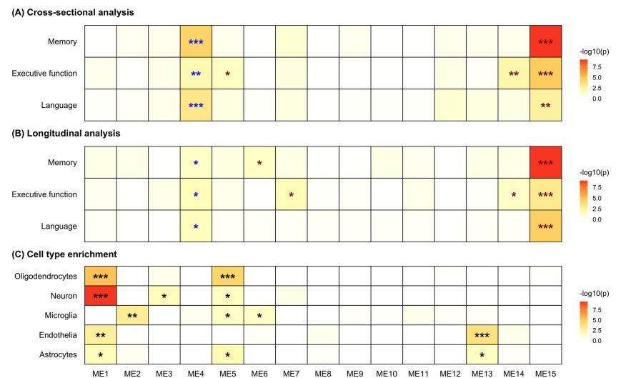 图7.与认知功能及脑细胞类型相关的模块鉴定;行代表每个模块的模块特征基因(MEs),列表示性状及脑细胞类型。热图展示经错误发现率(FDR)校正的 p 值,显著性水平由叠加的星号标注;*FDR p<0.05、**FDR p<0.01、***FDR p<0.001。在(A)和(B)图中,星号颜色表示 β 系数的方向性,蓝色表示负相关,红色表示正相关